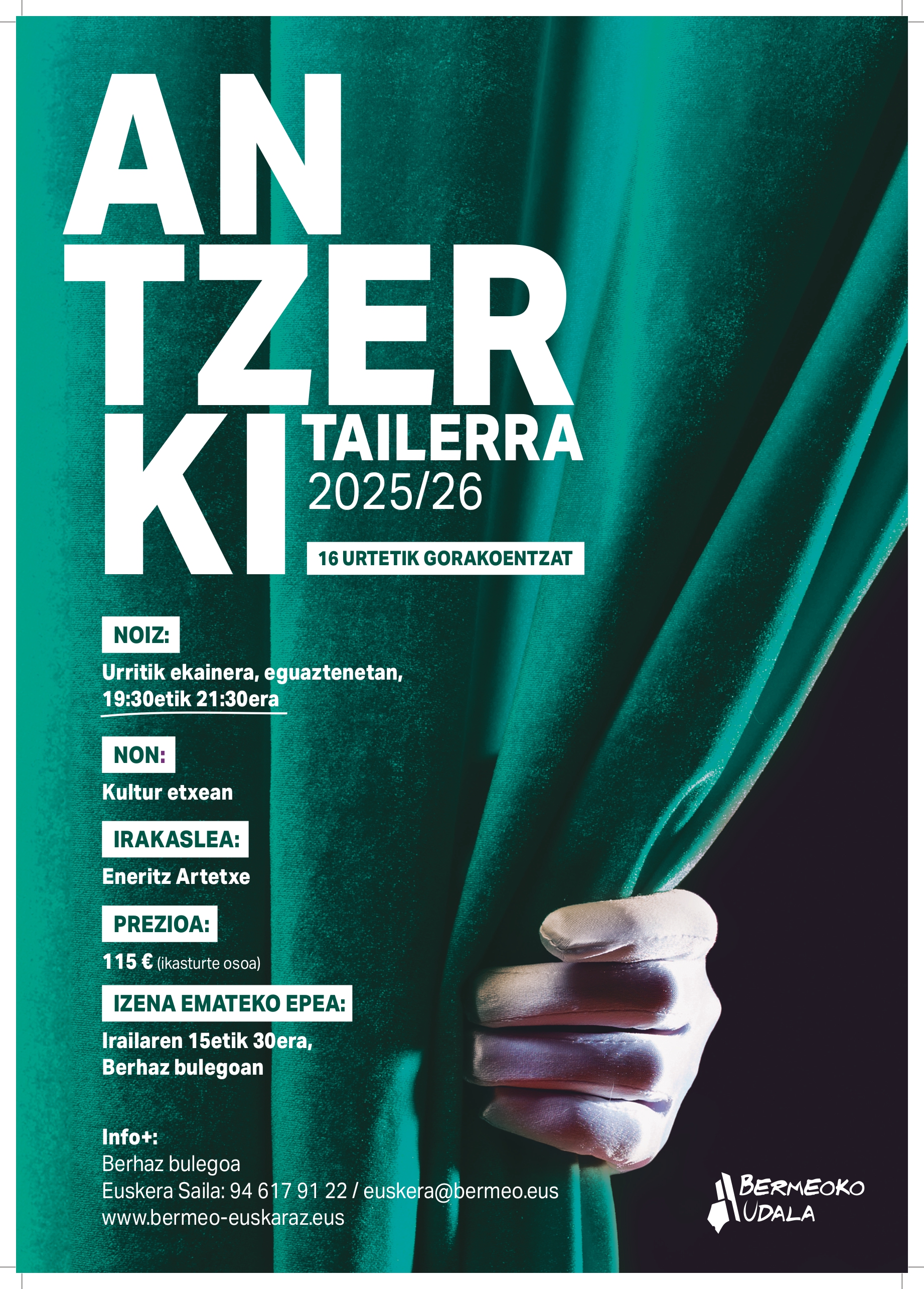 Bermeoko Udalak antzerki tailerra antolatu du ikasturte honetan, 2025eko urritik 2026ko ekainera bitarte. 16 urtetik gorako herritarrek parte hartu ahal izango dute. Tailerraren bidez lortu gura da sorkuntza-lanari bidea ematea eta ikasleek antzezteko beharrezko dituzten gaitasun funtsezkoenak eskuratzea, hala nola: